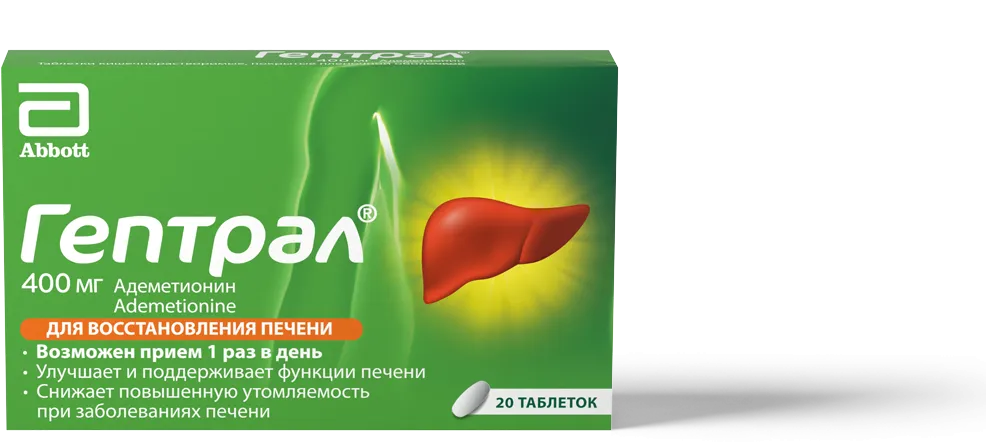 Препарат Гептрал® показан для восстановления печени при лечении ее хронических заболеваний. Согласно инструкции по применению, Гептрал® в таблетках по 400 мг пациентам нужно принимать между приемами пищи, по возможности в первой половине дня. Усвояемость препарата увеличивается при его применении натощак. Суточную дозу препарата можно принимать за 1 раз. Таблетки рекомендуется вынимать из ячейки упаковки непосредственно перед использованием1.