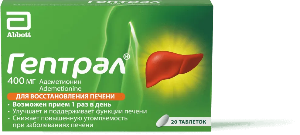 В комплексном лечении заболеваний печени активно используют гепатопротекторы. Представитель данной группы препаратов — Гептрал®. Он содержит адеметионин — необходимую для организма кислоту, выработка которой значительно снижается при патологиях печени6,7.